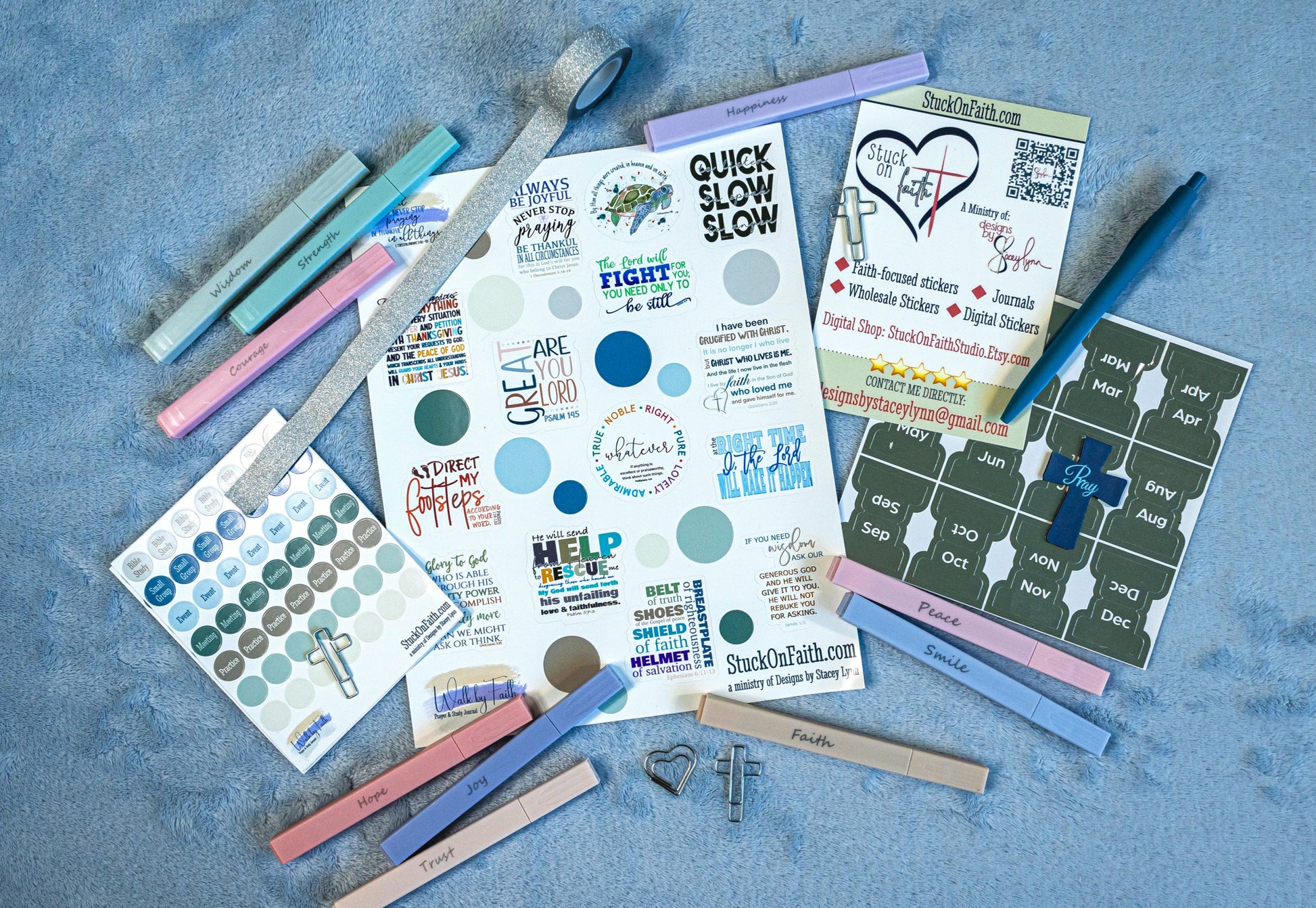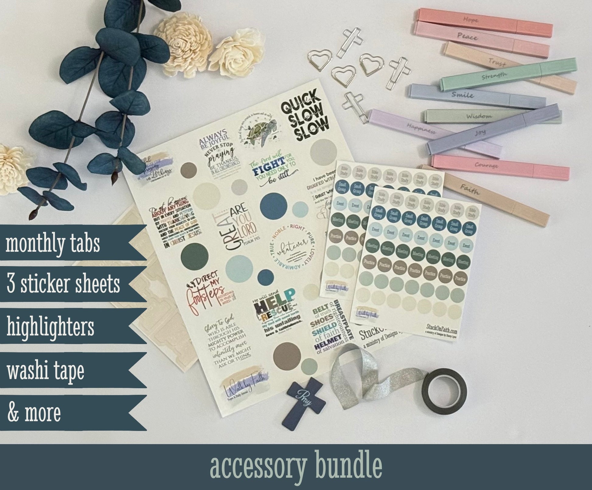 - Accessory Bundle (optional) includes sticker sheets, monthly tabs, highlighters, washi tape, magnetic bookmark & fun paper clips.